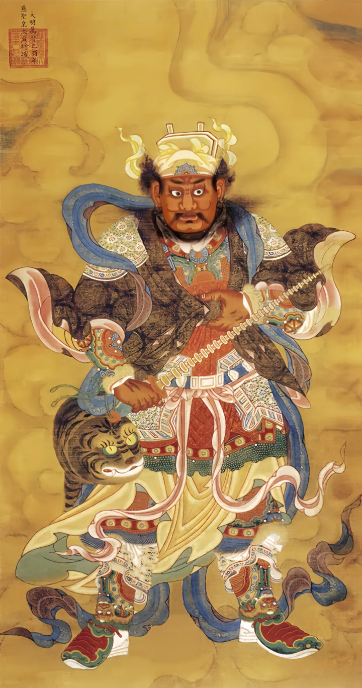 赵公明元帅,又称正一财神、玄坛真君、赵公元帅等,居督财府、神霄玉府,道教尊为“上清金轮院正一玄坛赵天君”、“黑虎玄坛赵公明元帅”、“玄化财神天尊”、“威灵显化天尊”等,其形象常为“铁色面,圆眼,黑胡须。戴铁幞头,黄抹额,披金甲,阜罩袍,绿靴,右手执二十四节铁鞭,左手执铁索,有黑虎随身。”